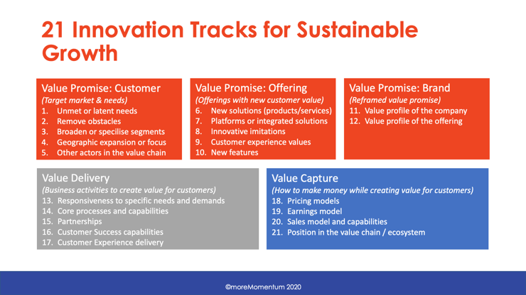 The innovative and forward moving companies have more variability and diversity in their innovation strategies and organisation, which lead to richer and better initiatives and help to escape from business-as-usual.